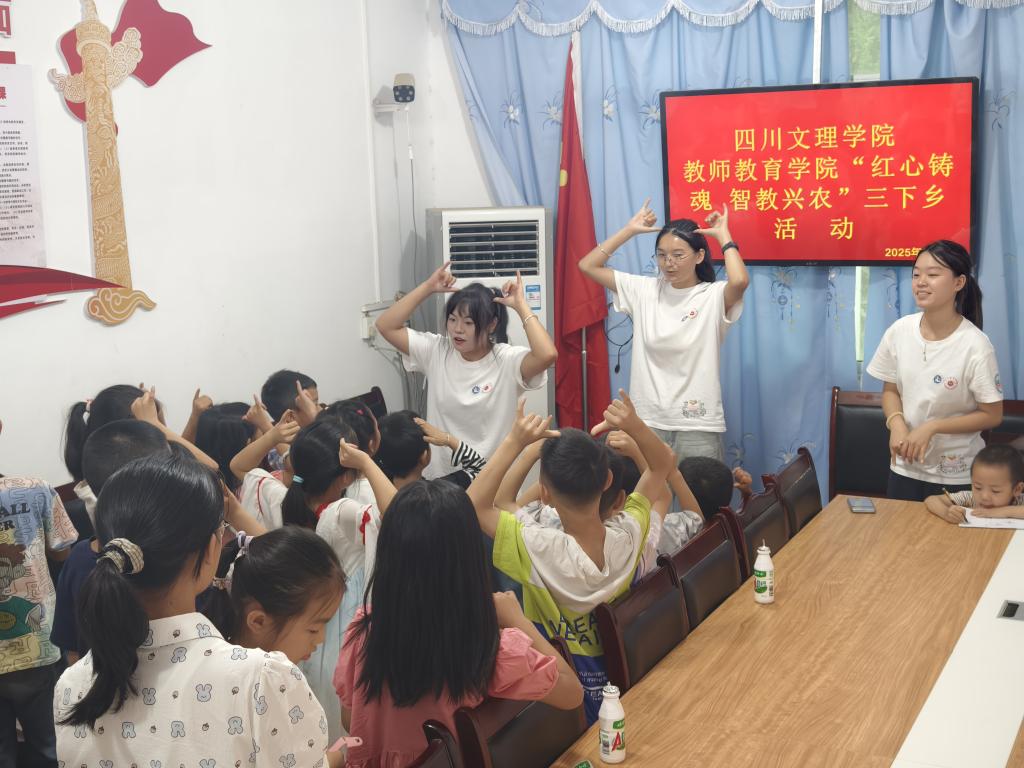 实践团深入乡村,与当地儿童开展趣味互动。在绘画活动中,孩子们用画笔描绘心中的美好世界;在十二生肖手语教学中,志愿者们耐心指导,孩子们跟随音乐节奏整齐展示,现场欢声笑语不断。